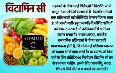 महामारी के दौरान कई विशेषज्ञों ने विटामिन सी से भरपूर भोजन लेने की सलाह दी है। विटामिन सी को एक शक्तिशाली एंटीऑक्सिडेंट के रूप में जाना जाता है, जो आपके शरीर (मुक्त कणों) में अस्थिर यौगिकों को बेअसर करता है जो कोशिकाओं में क्षति का कारण बनता है। इसके अलावा, कई जैव रासायनिक प्रक्रियाओं में पोषक तत्व की आवश्यकता होती है, जिनमें से कई प्रतिरक्षा स्वास्थ्य को बढ़ावा देने में मदद करते हैं। हर व्यक्ति को फिट रहने के लिए प्रतिदिन 90 मिलीग्राम विटामिन सी का सेवन करना चाहिए। इसके लिए आप नींबू, संतरा, शिमला मिर्च और अन्य पदार्थ खा सकते हैं।