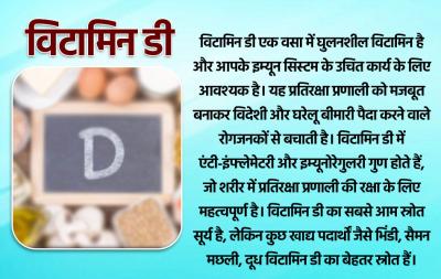 विटामिन डी एक वसा में घुलनशील विटामिन है और आपके इम्यून सिस्टम के उचित कार्य के लिए आवश्यक है। यह प्रतिरक्षा प्रणाली को मजबूत बनाकर विदेशी और घरेलू बीमारी पैदा करने वाले रोगजनकों से बचाती है। विटामिन डी में एंटी-इंफ्लेमेटरी और इम्यूनोरेगुलरी गुण होते हैं, जो शरीर में प्रतिरक्षा प्रणाली की रक्षा के लिए महत्वपूर्ण है। विटामिन डी का सबसे आम स्रोत सूर्य है, लेकिन कुछ खाद्य पदार्थों जैसे भिंडी, सैमन मछली, दूध विटामिन डी का बेहतर स्रोत हैं।