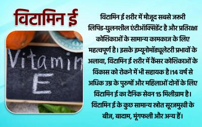 विटामिन ई शरीर में मौजूद सबसे जरूरी लिपिड-घुलनशील एंटीऑक्सिडेंट है और प्रतिरक्षा कोशिकाओं के सामान्य कामकाज के लिए महत्वपूर्ण है। इसके इम्यूनोमॉड्यूलेटरी प्रभावों के अलावा, विटामिन ई शरीर में कैंसर कोशिकाओं के विकास को रोकने में भी सहायक है।14 वर्ष से अधिक उम्र के पुरुषों और महिलाओं दोनों के लिए विटामिन ई का दैनिक सेवन 15 मिलीग्राम है। विटामिन ई के कुछ सामान्य स्रोत सूरजमुखी के बीज, बादाम, मूंगफली और अन्य हैं।