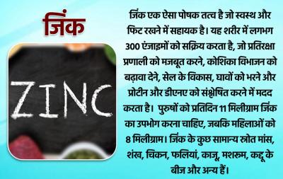 जिंक एक ऐसा पोषक तत्व है जो स्वस्थ और फिट रखने में सहायक है। यह शरीर में लगभग 300 एंजाइमों को सक्रिय करता है, जो प्रतिरक्षा प्रणाली को मजबूत करने, कोशिका विभाजन को बढ़ावा देने, सेल के विकास, घावों को भरने और प्रोटीन और डीएनए को संश्लेषित करने में मदद करता है। पुरुषों को प्रतिदिन 11 मिलीग्राम जिंक का उपभोग करना चाहिए, जबकि महिलाओं को 8 मिलीग्राम। जिंक के कुछ सामान्य स्रोत मांस, शंख, चिकन, फलियां, काजू, मशरूम, कद्दू के बीज और अन्य हैं।