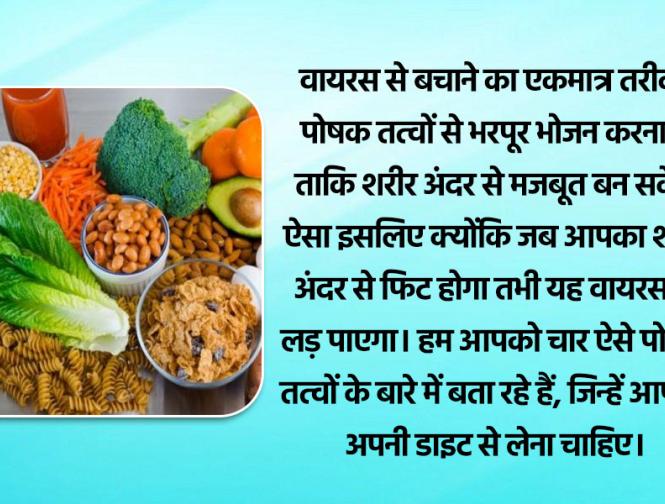 वायरस से बचाने का एकमात्र तरीका पोषक तत्वों से भरपूर भोजन करना है ताकि शरीर अंदर से मजबूत बन सके। ऐसा इसलिए क्योंकि जब आपका शरीर अंदर से फिट होगा तभी यह वायरस से लड़ पाएगा। हम आपको चार ऐसे पोषक तत्वों के बारे में बता रहे हैं, जिन्हें आपको अपनी डाइट से लेना चाहिए।