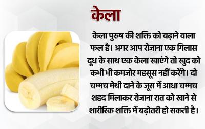 केला पुरुष की शक्ति को बढ़ाने वाला फल है। अगर आप रोजाना एक गिलास दूध के साथ एक केला खाएंगे तो खुद को कभी भी कमजोर महसूस नहीं करेंगे। दो चम्मच मेथी दाने के जूस में आधा चम्मच शहद मिलाकर रोजाना रात को खाने से शारीरिक शक्ति में बढ़ोतरी हो सकती है।