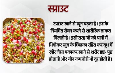स्प्राउट खाने से खून बढ़ता है। इसके नियमित सेवन करने से शारीरिक ताकत मिलती है। इसी तरह जौ को पानी में भिगोकर खुद के छिलका रहित कर दूध में खीर जैसा पकाकर खाने से शरीर हष्ट- पुष्ट होता है और यौन कमजोरी भी दूर होती है।