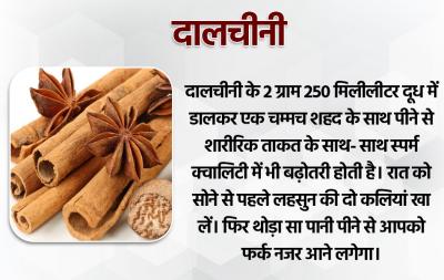 दालचीनी के 2 ग्राम 250 मिलीलीटर दूध में डालकर एक चम्मच शहद के साथ पीने से शारीरिक ताकत के साथ- साथ स्पर्म क्वालिटी में भी बढ़ोतरी होती है। रात को सोने से पहले लहसुन की दो कलियां खा लें। फिर थोड़ा सा पानी पीने से आपको फर्क नजर आने लगेगा।