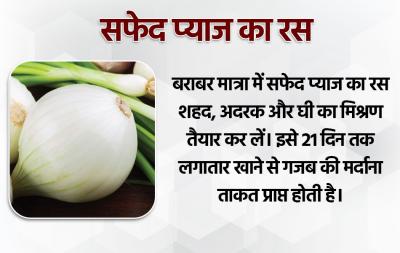बराबर मात्रा में सफेद प्याज का रस शहद, अदरक और घी का मिश्रण तैयार कर लें। इसे 21 दिन तक लगातार खाने से गजब की मर्दाना ताकत प्राप्त होती है।