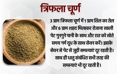 3 ग्राम त्रिफला चूर्ण में 1 ग्राम तिल का तेल और 6 ग्राम शहद मिलाकर रोजाना खाली पेट गुनगुने पानी के साथ और रात को सोते समय गर्म दूध के साथ सेवन करें। इसके सेवन से पेट से जुड़ी समस्याएं दूर रहती है। साथ ही धातु संबंधित सभी तरह की समस्याएं भी दूर रहती है।