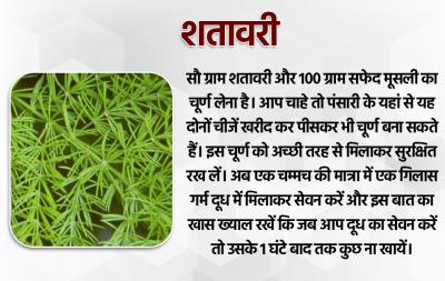 सौ ग्राम शतावरी और 100 ग्राम सफेद मूसली का चूर्ण लेना है। आप चाहे तो पंसारी के यहां से यह दोनों चीजें खरीद कर पीसकर भी चूर्ण बना सकते हैं। इस चूर्ण को अच्छी तरह से मिलाकर सुरक्षित रख लें। अब एक चम्मच की मात्रा में एक गिलास गर्म दूध में मिलाकर सेवन करें और इस बात का खास ख्याल रखें कि जब आप दूध का सेवन करें तो उसके 1 घंटे बाद तक कुछ ना खायें।