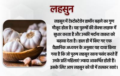 लहसुन में टेस्टोस्टेरोन हार्मोन बढ़ाने का गुण मौजूद होता है। यह पुरुषों की सेक्स लाइफ में सुधार करता है और उनकी मर्दाना ताकत को बढ़ावा देता है। हाल ही में किए गए एक वैज्ञानिक अध्ययन के अनुसार यह दावा किया गया है कि जो पुरुष लहसुन खाना पसंद करते हैं उनके प्रति महिलाएं ज्यादा आकर्षित होती हैं। इसके लिए आप लहसुन को घी में तलकर खाएं।