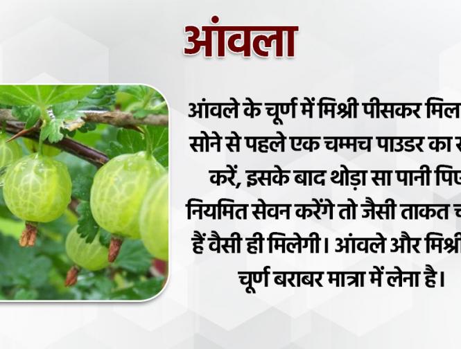 आंवले के चूर्ण में मिश्री पीसकर मिला लें। सोने से पहले एक चम्मच पाउडर का सेवन करें, इसके बाद थोड़ा सा पानी पिए। नियमित सेवन करेंगे तो जैसी ताकत चाहते हैं वैसी ही मिलेगी। आंवले और मिश्री का चूर्ण बराबर मात्रा में लेना है।