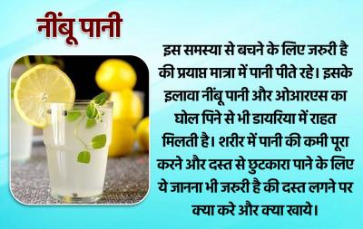 इस समस्या से बचने के लिए जरुरी है की प्रयाप्त मात्रा में पानी पीते रहे। इसके इलावा नींबू पानी और ओआरएस का घोल पिने से भी डायरिया में राहत मिलती है। शरीर में पानी की कमी पूरा करने और दस्त से छुटकारा पाने के लिए ये जानना भी जरुरी है की दस्त लगने पर क्या करे और क्या खाये।