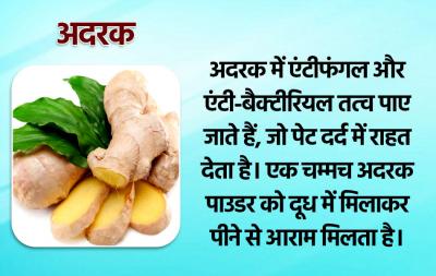 अदरक में एंटीफंगल और एंटी-बैक्टीरियल तत्व पाए जाते हैं, जो पेट दर्द में राहत देता है। एक चम्मच अदरक पाउडर को दूध में मिलाकर पीने से आराम मिलता है।