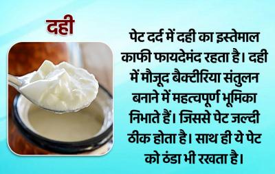 पेट दर्द में दही का इस्तेमाल काफी फायदेमंद रहता है। दही में मौजूद बैक्टीरिया संतुलन बनाने में महत्वपूर्ण भूमिका निभाते हैं। जिससे पेट जल्दी ठीक होता है। साथ ही ये पेट को ठंडा भी रखता है।