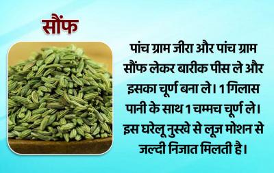 पांच ग्राम जीरा और पांच ग्राम सौंफ लेकर बारीक पीस ले और इसका चूर्ण बना ले। 1 गिलास पानी के साथ 1 चम्मच चूर्ण ले। इस घरेलू नुस्खे से लूज मोशन से जल्दी निजात मिलती है।