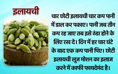 चार छोटी इलायची चार कप पानी में डाल कर पकाए। पानी जब तीन कप रह जाए तब इसे ठंडा होने के लिए रख दे। दिन में हर चार घंटे के बाद एक कप पानी पिए। छोटी इलायची लूज मोशन का इलाज करने में काफी फायदेमंद है।