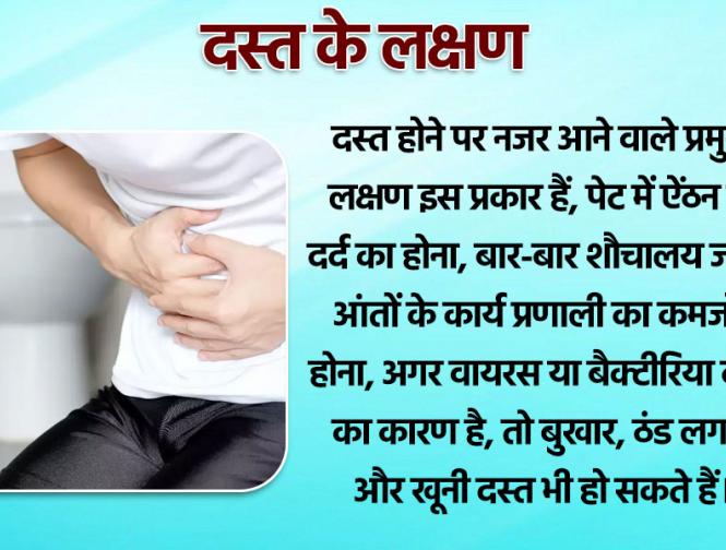 दस्त होने पर नजर आने वाले प्रमुख लक्षण इस प्रकार हैं, पेट में ऐंठन या दर्द का होना, बार-बार शौचालय जाना, आंतों के कार्य प्रणाली का कमजोर होना, अगर वायरस या बैक्टीरिया दस्त का कारण है, तो बुखार, ठंड लगना और खूनी दस्त भी हो सकते हैं।