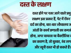 1 / 8दस्त होने पर नजर आने वाले प्रमुख लक्षण इस प्रकार हैं, पेट में ऐंठन या दर्द का होना, बार-बार शौचालय जाना, आंतों के कार्य प्रणाली का कमजोर होना, अगर वायरस या बैक्टीरिया दस्त का कारण है, तो बुखार, ठंड लगना और खूनी दस्त भी हो सकते हैं।2 / 8इस समस्या से बचने के लिए जरुरी है की प्रयाप्त मात्रा में पानी पीते रहे। इसके इलावा नींबू पानी और ओआरएस का घोल पिने से भी डायरिया में राहत मिलती है। शरीर में पानी की कमी पूरा करने और दस्त से छुटकारा पाने के लिए ये जानना भी जरुरी है की दस्त लगने पर क्या करे और क्या खाये।3 / 8अदरक में एंटीफंगल और एंटी-बैक्टीरियल तत्व पाए जाते हैं, जो पेट दर्द में राहत देता है। एक चम्मच अदरक पाउडर को दूध में मिलाकर पीने से आराम मिलता है।4 / 8पेट दर्द में दही का इस्तेमाल काफी फायदेमंद रहता है। दही में मौजूद बैक्टीरिया संतुलन बनाने में महत्वपूर्ण भूमिका निभाते हैं। जिससे पेट जल्दी ठीक होता है। साथ ही ये पेट को ठंडा भी रखता है।5 / 8केले में मौजूद पेक्टिन पेट को बांधने का काम करता है। इसमें मौजूद पोटैशियम की उच्च मात्रा भी शरीर के लिए फायदेमंद होती है। इस समस्या से राहत पाने के लिए आप काले नमक के साथ केले का सेवन कर सकते हैं। 6 / 8अगर आपको लगातार दस्त हो रहे हों तो एक चम्मच जीरा चबा लें। अमूमन सभी घरों में मिलने वाला ये मसाला दस्त में काफी फायदेमंद है। जीरा चबाकर पानी पी लेने से दस्त बहुत जल्दी रुक जाते हैं।7 / 8पांच ग्राम जीरा और पांच ग्राम सौंफ लेकर बारीक पीस ले और इसका चूर्ण बना ले। 1 गिलास पानी के साथ 1 चम्मच चूर्ण ले। इस घरेलू नुस्खे से लूज मोशन से जल्दी निजात मिलती है।8 / 8चार छोटी इलायची चार कप पानी में डाल कर पकाए। पानी जब तीन कप रह जाए तब इसे ठंडा होने के लिए रख दे। दिन में हर चार घंटे के बाद एक कप पानी पिए। छोटी इलायची लूज मोशन का इलाज करने में काफी फायदेमंद है।