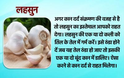 अगर कान दर्द संक्रमण की वजह से है तो लहसुन का इस्तेमाल आपको राहत देगा। लहसुन की एक या दो कली को तिल के तेल में गर्म करें। इसे ठंडा होने दें जब यह तेल ठंडा हो जाए तो इसकी एक या दो बूंद कान में डालिए। ऐसा करने से कान दर्द से राहत मिलेगा।