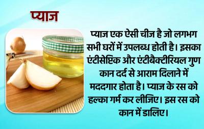प्याज एक ऐसी चीज है जो लगभग सभी घरों में उपलब्ध होती है। इसका एंटीसेप्टिक और एंटीबैक्टीरियल गुण कान दर्द से आराम दिलाने में मददगार होता है। प्याज के रस को हल्का गर्म कर लीजिए। इस रस को कान में डालिए।