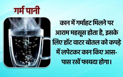कान में गर्माहट मिलने पर आराम महसूस होता है, इसके लिए हॉट वाटर बोतल को कपड़े में लपेटकर कान किए आस- पास रखें फायदा होगा।