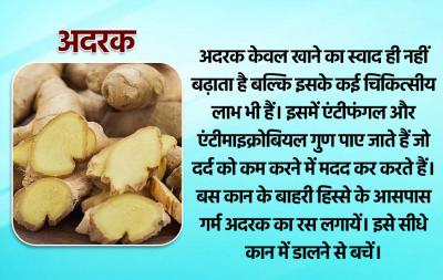 अदरक केवल खाने का स्वाद ही नहीं बढ़ाता है बल्कि इसके कई चिकित्सीय लाभ भी हैं। इसमें एंटीफंगल और एंटीमाइक्रोबियल गुण पाए जाते हैं जो दर्द को कम करने में मदद कर करते हैं। बस कान के बाहरी हिस्से के आसपास गर्म अदरक का रस लगायें। इसे सीधे कान में डालने से बचें।