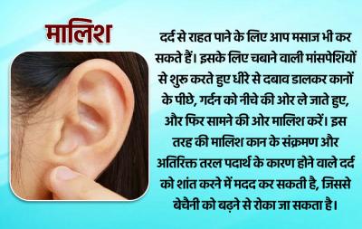 दर्द से राहत पाने के लिए आप मसाज भी कर सकते हैं। इसके लिए चबाने वाली मांसपेशियों से शुरू करते हुए धीरे से दबाव डालकर कानों के पीछे, गर्दन को नीचे की ओर ले जाते हुए, और फिर सामने की ओर मालिश करें। इस तरह की मालिश कान के संक्रमण और अतिरिक्त तरल पदार्थ के कारण होने वाले दर्द को शांत करने में मदद कर सकती है, जिससे बेचैनी को बढ़ने से रोका जा सकता है।