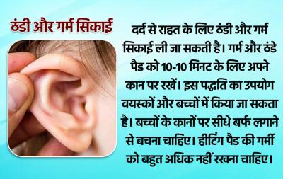 दर्द से राहत के लिए ठंडी और गर्म सिकाई ली जा सकती है। गर्म और ठंडे पैड को 10-10 मिनट के लिए अपने कान पर रखें। इस पद्धति का उपयोग वयस्कों और बच्चों में किया जा सकता है। बच्चों के कानों पर सीधे बर्फ लगाने से बचना चाहिए। हीटिंग पैड की गर्मी को बहुत अधिक नहीं रखना चाहिए।