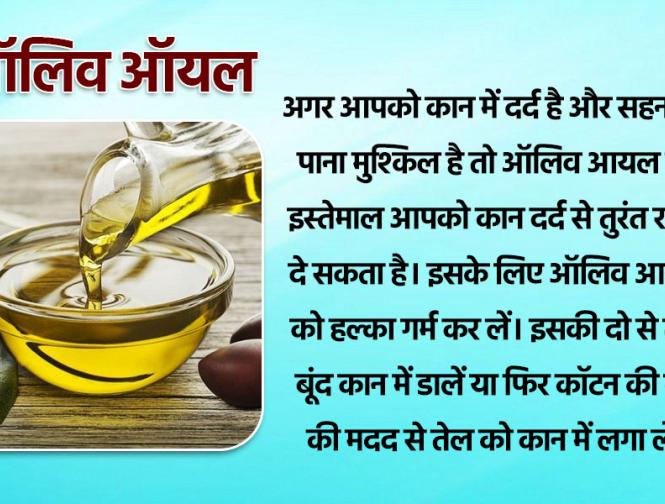 अगर आपको कान में दर्द है और सहन कर पाना मुश्किल है तो ऑलिव आयल का इस्तेमाल आपको कान दर्द से तुरंत राहत दे सकता है। इसके लिए ऑलिव आयल को हल्का गर्म कर लें। इसकी दो से तीन बूंद कान में डालें या फिर कॉटन की बढ़ की मदद से तेल को कान में लगा लें।
