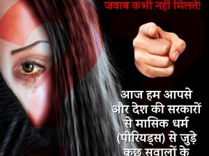1 / 9आज भी हम सरकार से मासिक धर्म को लेकर कुछ सवालों के जवाब चाहते हैं।2 / 9महिलाएं और लड़कियां मासिक धर्म (पीरियड्स) को लेकर कई तरह की दुविधाएं मन में रखती हैं।3 / 9मासिक धर्म (पीरियड्स) में एक तरह से लड़कियों और महिलाओं से अछूतों की तरह व्यवहार किया जाता है।4 / 9सेनेटरी पैड आम महिलाओं की पहुंच से आज भी बाहर क्यों हैं?5 / 9मासिक धर्म (पीरियड्स) को हमने एक बोझ क्यों बना लिया है?6 / 9पैड खरीदने में एक लड़की की माँ को आज भी शर्म क्यों आती है?7 / 9महिलाएं आज भी उन पुराने कपड़ों का इस्तेमाल क्यों करती हैं जो घर में नहीं रखे जाते?8 / 9मासिक धर्म 'पीरियड्स' को अपवित्र क्यों माना जाता है?9 / 9इस ओर सरकार का रवैया आज भी ढ़ीला क्यों है?