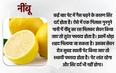 कई बार पेट में गैस बढ़ने के कारण सिर दर्द होता है। ऐसे में एक गिलास गुनगुने पानी में नींबू का रस मिलकर सेवन किया जाए तो तुरंत फायदा होता है। इसमें थोड़ा शहद मिलाया जा सकता है। इसका सेवन रोज सुबह खाली पेट किया जाए तो स्थायी फायदा होता है। पेट शांत रहेगा और सिर दर्द भी नहीं होगा।
