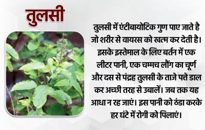 तुलसी में एंटीबायोटिक गुण पाए जाते है जो शरीर से वायरस को खत्म कर देती है। इसके इस्तेमाल के लिए बर्तन में एक लीटर पानी, एक चम्मच लौंग का चूर्ण और दस से पंद्रह तुलसी के ताजे पत्ते डाल कर अच्छी तरह से उबालें। जब तक यह आधा न रह जाएं। इस पानी को ठंडा करके हर घंटे में रोगी को पिलाएं।