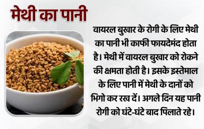 वायरल बुखार के रोगी के लिए मेथी का पानी भी काफी फायदेमंद होता है। मेथी में वायरल बुखार को रोकने की क्षमता होती है। इसके इस्तेमाल के लिए पानी में मेथी के दानों को भिगो कर रख दें। अगले दिन यह पानी रोगी को घंटे-घंटे बाद पिलाते रहे।