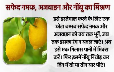 इसे इस्तेमाल करने के लिए एक छोटा चम्मच सफेद नमक और अजवाइन को तब तक भूनें, जब तक इसका रंग न बदल जाएं। अब इसे एक गिलास पानी में मिक्स करें। फिर इसमें नींबू निचोड़ कर दिन में दो या तीन बार पीएं।