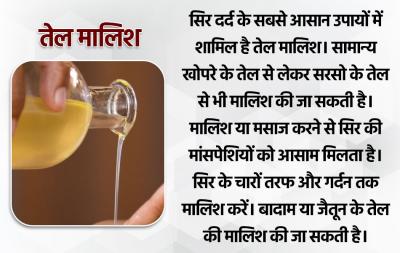 सिर दर्द के सबसे आसान उपायों में शामिल है तेल मालिश। सामान्य खोपरे के तेल से लेकर सरसो के तेल से भी मालिश की जा सकती है। मालिश या मसाज करने से सिर की मांसपेशियों को आसाम मिलता है। सिर के चारों तरफ और गर्दन तक मालिश करें। बादाम या जैतून के तेल की मालिश की जा सकती है।