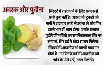 सिरदर्द में राहत पाने के लिए अदरक से अच्छे कुछ नहीं है। अदरक के टुकड़ों को पानी में डालकर अच्छे से उबाल ले और फिर उससे भाप लें, लाभ होगा। इसके अलावा पुदीने की पत्तियों का रस निकालकर सिर पर लगा लें, सिर दर्द में थोड़ा आराम मिलेगा। सिरदर्द में आइसपैक भी काफी मददगार होती है। माइग्रेन के दर्द में आइसपैक को गर्दन के पीछे रखें, राहत मिलेगी।