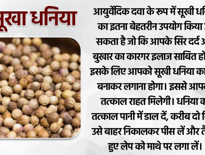 आयुर्वेदिक दवा के रूप में सूखी धनिया का इतना बेहतरीन उपयोग किया जा सकता है जो कि आपके सिर दर्द और बुखार का कारगर इलाज साबित होगी। इसके लिए आपको सूखी धनिया का लेप बनाकर लगाना होगा। इससे आपको तत्काल राहत मिलेगी। धनिया को तत्काल पानी में डाल दें, करीब दो मिनट उसे बाहर निकालकर पीस लें और तैयार हुए लेप को माथे पर लगा लें।