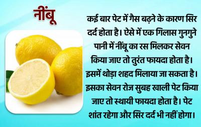 कई बार पेट में गैस बढ़ने के कारण सिर दर्द होता है। ऐसे में एक गिलास गुनगुने पानी में नींबू का रस मिलकर सेवन किया जाए तो तुरंत फायदा होता है। इसमें थोड़ा शहद मिलाया जा सकता है। इसका सेवन रोज सुबह खाली पेट किया जाए तो स्थायी फायदा होता है। पेट शांत रहेगा और सिर दर्द भी नहीं होगा।