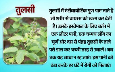 तुलसी में एंटीबायोटिक गुण पाए जाते है जो शरीर से वायरस को खत्म कर देती है। इसके इस्तेमाल के लिए बर्तन में एक लीटर पानी, एक चम्मच लौंग का चूर्ण और दस से पंद्रह तुलसी के ताजे पत्ते डाल कर अच्छी तरह से उबालें। जब तक यह आधा न रह जाएं। इस पानी को ठंडा करके हर घंटे में रोगी को पिलाएं।