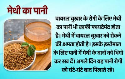 वायरल बुखार के रोगी के लिए मेथी का पानी भी काफी फायदेमंद होता है। मेथी में वायरल बुखार को रोकने की क्षमता होती है। इसके इस्तेमाल के लिए पानी में मेथी के दानों को भिगो कर रख दें। अगले दिन यह पानी रोगी को घंटे-घंटे बाद पिलाते रहे।