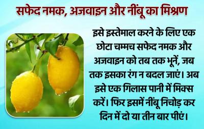 इसे इस्तेमाल करने के लिए एक छोटा चम्मच सफेद नमक और अजवाइन को तब तक भूनें, जब तक इसका रंग न बदल जाएं। अब इसे एक गिलास पानी में मिक्स करें। फिर इसमें नींबू निचोड़ कर दिन में दो या तीन बार पीएं।