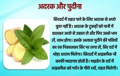 सिरदर्द में राहत पाने के लिए अदरक से अच्छे कुछ नहीं है। अदरक के टुकड़ों को पानी में डालकर अच्छे से उबाल ले और फिर उससे भाप लें, लाभ होगा। इसके अलावा पुदीने की पत्तियों का रस निकालकर सिर पर लगा लें, सिर दर्द में थोड़ा आराम मिलेगा। सिरदर्द में आइसपैक भी काफी मददगार होती है। माइग्रेन के दर्द में आइसपैक को गर्दन के पीछे रखें, राहत मिलेगी।