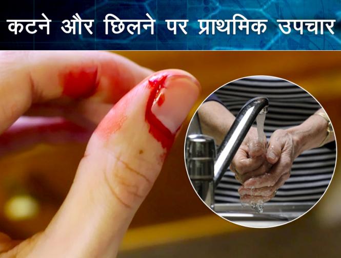 पूरे भाग को साबुन तथा गुनगुने पानी से साफ करें ताकि धूल हट जाये। घाव पर सीधे तब तक दबाव डालें, जब तक खून का बहना बंद न हो जाये। घाव पर असंक्रामक पट्टी बांधें। यदि घाव गहरा हो तो जल्दी से चिकित्सक से संपर्क करें। छिलना या जख्म होने पर साबुन और गुनगुने पानी से धोयें। यदि खून बह रहा हो तो इसे संक्रमण से बचाने के लिए पट्टी से ढंक दें।