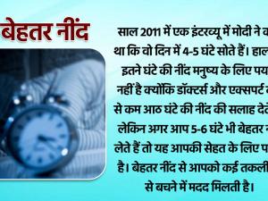 1 / 5साल 2011 में एक इंटरव्यू में मोदी ने कहा था कि वो दिन में 4-5 घंटे सोते हैं। हालांकि इतने घंटे की नींद मनुष्य के लिए पर्याप्त नहीं है क्योंकि डॉक्टर्स और एक्सपर्ट कम से कम आठ घंटे की नींद की सलाह देते हैं। लेकिन अगर आप 5-6 घंटे भी बेहतर नींद लेते हैं तो यह आपकी सेहत के लिए पर्याप्त है। बेहतर नींद से आपको कई तकलीफों से बचने में मदद मिलती है। 2 / 5मोदी योग में विश्वास रखते हैं। उनकी फिटनेस में योग का अहम रोल है। वो अक्सर लोगों को योग करने की सलाह देते हैं। योग दिवस जैसे फिटनेस के बड़े कार्यक्रम में बढ़ चढ़कर हिस्सा लेते हैं। इतना ही नहीं वो नियमित रूप से सूर्य नमस्कार और प्राणायाम के साथ दिन शुरू करते हैं। 3 / 5प्रधानमंत्री मोदी को साधारण खाना पसंद है। उन्हें दाल और चावल से बनी खिचड़ी में घी डालकर खाना अच्छा लगता है। इसे पचाना आसान है और इससे आपको सभी आवश्यक पोषक तत्व मिलते हैं। मोदी ज्यादा मसालेदार खाना पसंद नहीं करते हैं। इसके अलावा वो नींबू पानी पसंद करते हैं जिससे उन्हें अपनी बॉडी को डेटोक्स करने में मदद मिलती है।4 / 5तनाव आज की सबसे बड़ी समस्या है। जाहिर है मोदी जिस पद पर हैं उनसे ज्यादा तनावपूर्ण काम शायद ही किसी का हो। ऐसे में वो तनावमुक्त रहने के लिए मेडिटेशन का सहारा लेते हैं जिससे उन्हें शांत रहने में मदद मिलती है। एक्सपर्ट इस बात को मानते हैं कि रोजाना मेडिटेशन करने से तनाव के लक्षणों को कम करने और उससे होने वाली मानसिक समस्याओं से बचने में मदद मिलती है।5 / 5पीएम मोदी रोजाना सुबह नंगे पांव घास, पानी और कंकड़ पर चलते हैं। अपने ट्विटर पोस्ट में, वह कहते हैं कि इससे उन्हें तरोताजा रहने में मदद मिलती है। अगर आपको हमेशा हेल्दी और फिट रहना है, तो आपको मोदी के इन नियमों का पालन करना चाहिए। अगर वो इतने बिजी जीवन से अपने लिए समय निकाल लेते हैं, तो आप क्यों नहीं?