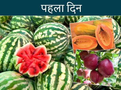 पहले दिन आप जितना चाहें उतने फल खा सकते हैं। आप तरबूज, पपीता, सेब और कीवी आदि फल खा सकते हैं। आपको दिन में 8 से 12 गिलास पानी पीना चाहिए। यदि आपको भूख लगती है, तो आप कुछ फल ले सकते हैं और अपनी लालसा को पूरा कर सकते हैं।
