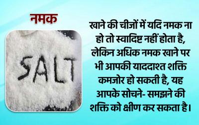 खाने की चीजों में यदि नमक ना हो तो स्वादिष्ट नहीं होता है, लेकिन अधिक नमक खाने पर भी आपकी याददाश्त शक्ति कमजोर हो सकती है, यह आपके सोचने- समझने की शक्ति को क्षीण कर सकता है।