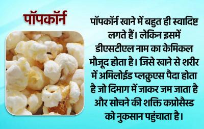 पॉपकॉर्न खाने में बहुत ही स्वादिष्ट लगते हैं। लेकिन इसमें डीएसटीएल नाम का केमिकल मौजूद होता है। जिसे खाने से शरीर में अमिलोईड प्लक्रुएस पैदा होता है जो दिमाग में जाकर जम जाता है और सोचने की शक्ति कप्रोसैस्ड को नुकसान पहुंचाता है।
