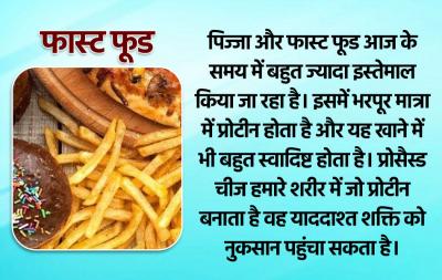 पिज्जा और फास्ट फूड आज के समय में बहुत ज्यादा इस्तेमाल किया जा रहा है। इसमें भरपूर मात्रा में प्रोटीन होता है और यह खाने में भी बहुत स्वादिष्ट होता है। प्रोसैस्ड चीज हमारे शरीर में जो प्रोटीन बनाता है वह याददाश्त शक्ति को नुकसान पहुंचा सकता है।