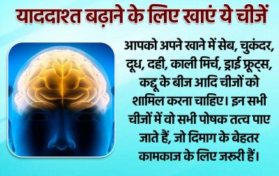 आपको अपने खाने में सेब, चुकंदर, दूध, दही, काली मिर्च, ड्राई फ्रूट्स, कद्दू के बीज आदि चीजों को शामिल करना चाहिए। इन सभी चीजों में वो सभी पोषक तत्व पाए जाते हैं, जो दिमाग के बेहतर कामकाज के लिए जरूरी हैं।