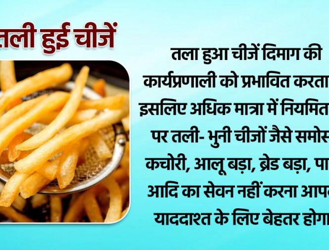 तला हुआ चीजें दिमाग की कार्यप्रणाली को प्रभावित करता है। इसलिए अधिक मात्रा में नियमित तौर पर तली- भुनी चीजों जैसे समोसा, कचोरी, आलू बड़ा, ब्रेड बड़ा, पापड़ आदि का सेवन नहीं करना आपकी याददाश्त के लिए बेहतर होगा।