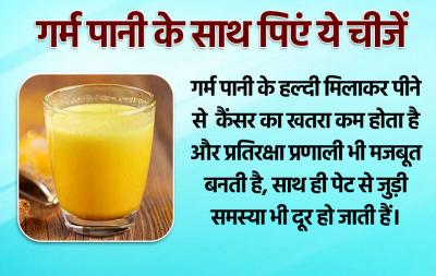 गर्म पानी के हल्दी मिलाकर पीने से कैंसर का खतरा कम होता है और प्रतिरक्षा प्रणाली भी मजबूत बनती है, साथ ही पेट से जुड़ी समस्या भी दूर हो जाती हैं।
