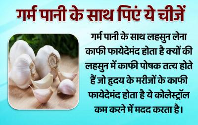 गर्म पानी के साथ लहसुन लेना काफी फायेदेमंद होता है क्यों की लहसुन में काफी पोषक तत्व होते हैं जो हृदय के मरीजों के काफी फायेदेमंद होता है ये कोलेस्ट्रॉल कम करने में मदद करता है।